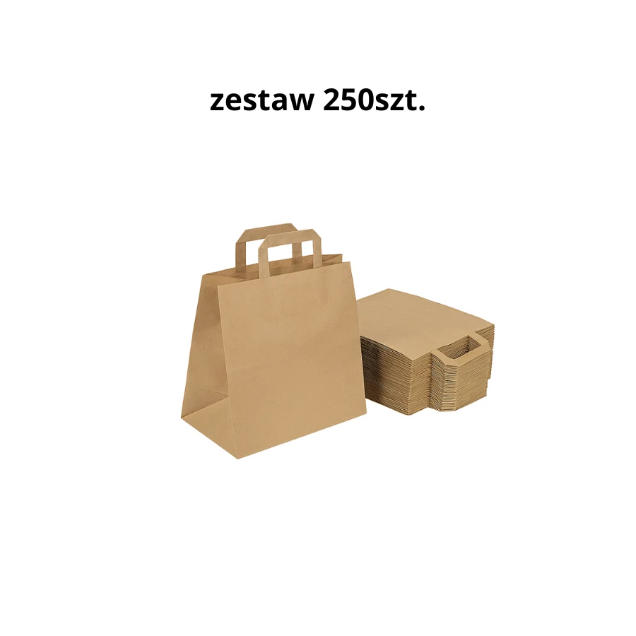 Zestaw 250 szt. – Torba papierowa kraft brązowa z płaskim uchwytem 26 × 17 × 26 cm – torba gastronomiczna